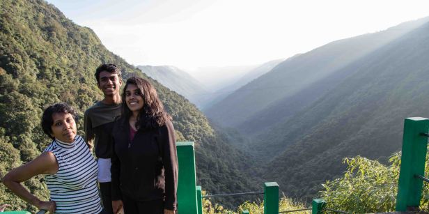 The Mawkdok Dympep Valley is a must stop for people travelling on towards Sohra. It gives one very good views of the Khasi Hills. There is a viewpoint that has been built adjacent to the Duwan Sing Syiem Bridge. It cannot be missed as it has a well marked signboard. You have to walk down steps to the reach the view point. There are multiple levels of the viewing platform. We still had quite a long way to go before we reached the place of stay for the night. So we chose to go down only to the first one. Here is a photo of us there: