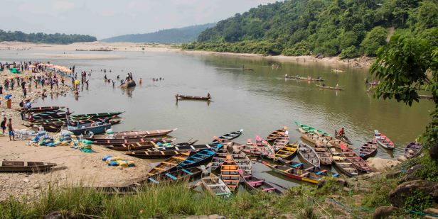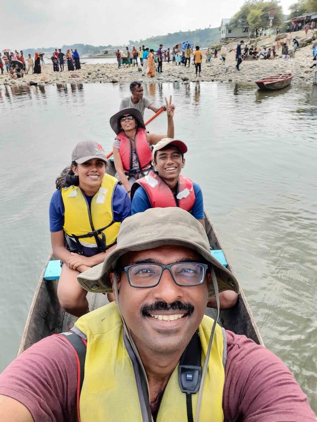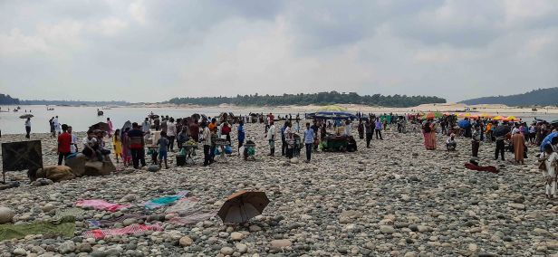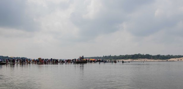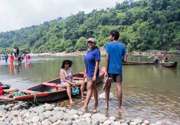 As we returned to the spot where we had to get on, we saw lot of people on a rock in the river and a crowd beyond. The boatman said that the rock was a marker of the border between India and Bangladesh.