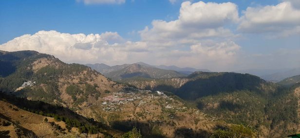 Here is a view of the snow-capped Nanda Devi range of the Himalayas in the background.