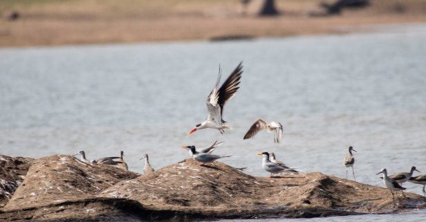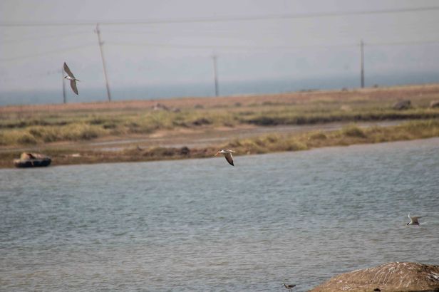 I could feel the anticipation build up as we neared the patch. We parked the car and slowly walked towards the backwaters through some fields. The moment we were able to see the backwaters from a distance we peered through our binoculars. There were no birds that were sitting on the river bank unlike what Rahul had seen. But we could see a flock of birds perched on a rock in the river. Suddenly they all took flight; a Peregrine Falcon! If the birds all flew off further they could be anywhere!The backwaters is a very large area. Searching for it elsewhere other than in its usual patch, would be a herculean task. We anxiously scanned the birds in flight. “They are there!”, we exclaimed. There were two of them flying among the River Terns. We could see clear differences between them; their style of flying, their size and of course their unique beak,