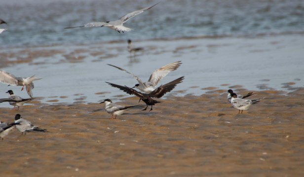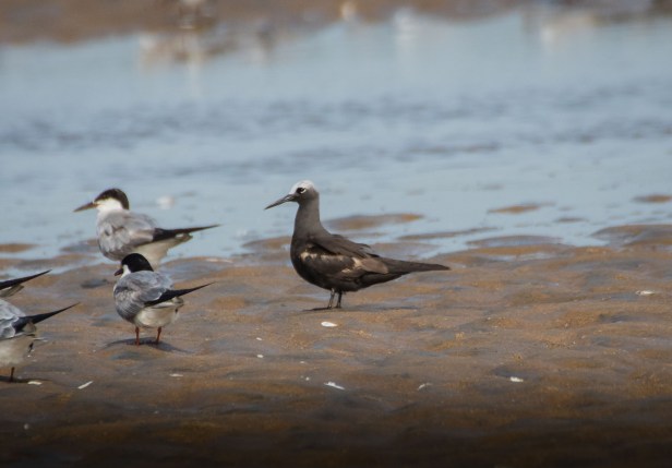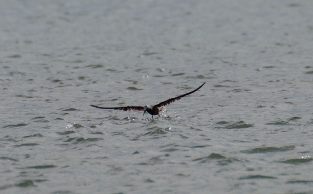 30 minutes had gone past. By now all of us were on the sandy beach and walking in different directions. The water level had risen some more. A bit of the sand bar had become submerged. The flock of Terns were still there but had a moved a bit further away. Dhanapal and I were close to the boat and scanned the waterway connecting the sand bar and the open sea. We noticed the dark bird that had been flying over the open waters earlier, flying in the direction of the sand bar. We continued to follow it. As it came closer, it became clear as to what it was; the Lesser Noddy!