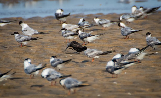 Here is how it appeared to us when we first saw it sitting on the sand bar along with the terns. You can see it as the black spot in the middle ๐ .