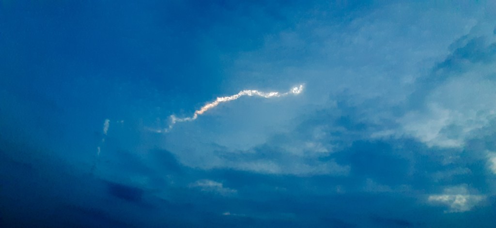 We wanted to see if we could catch the sunrise at the pier. So we were out by 5:00am from the lodge. With a short coffee/tea break in between, we were at the pier by 5:40am. As Albin parked the car, we all heard a strange loud reverberating roar. All of us got out of the car immediately to investigate what it was. It seemed to be coming from up in the sky. Looking up, we saw an unusual plume. Here is a photo of what we saw.