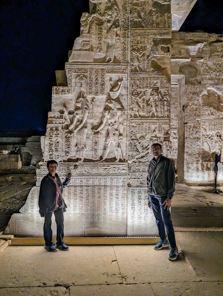 By evening, the cruise boat had reached the town of Kom Ombo. Once the boat docked, it was time to visit the Temple of Kom Ombo in the evening. It was already dark. So it was going to be enjoying the temple with it being lit up.